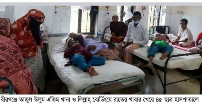 হ্যালো 24 নিউজ।। দিনাজপুরের বীরগঞ্জ উপজেলায় গতকাল বুধবার তাজুল উলুম এতিম খানা ও লিল্লাহ্ বোর্ডিংয়ে রাতের খাবার খেয়ে খাদ্যে বিষ-ক্রিয়ায় ৪৫ জন শিশু ছাত্রকে হাসপাতালে ভর্তি করা হয়েছে।