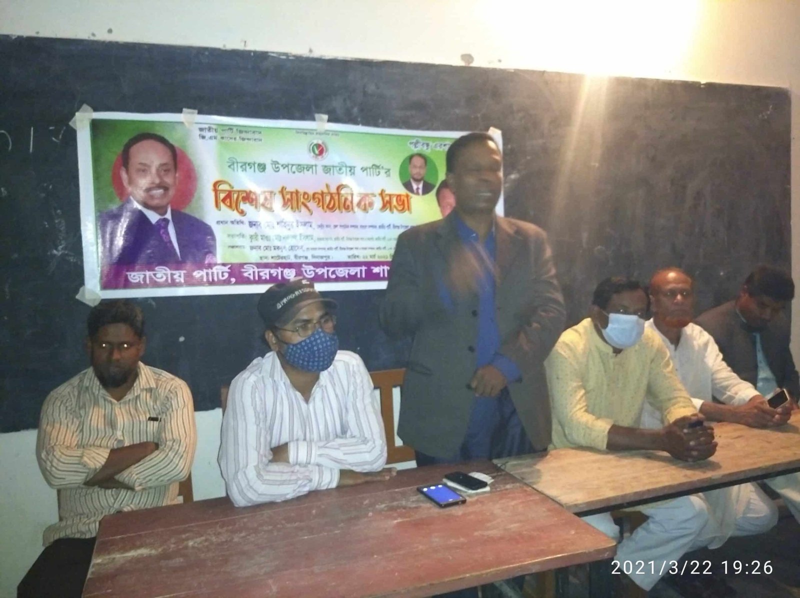 হ্যালো 24 নিউজ।। ২২ মার্চ ২০২১ সোমবার সন্ধ্যা ৬-০০ ঘটিকায় মাটিয়াকুড়া দ্বিমুখী উচ্চ বিদ্যালয়ে বীরগঞ্জ উপজেলা জাতীয় পার্টির বিশেষ সাংগঠনিক সভা অনুষ্ঠিত হয়েছে। সাংগঠনিক আলোচনা সভায় প্রধান অতিথি হিসেবে উপস্থিত ছিলেন জাতীয় পার্টি কেন্দ্রীয় কমিটির সদস্য, দিনাজপুর জেলা জাপার সাংগঠনিক সম্পাদক ও বীরগঞ্জ উপজেলা জাতীয় পার্টি সাধারণ সম্পাদক মোঃ শাহিনুর ইসলাম। সভায় সভাপতিত্ব করেন বীরগঞ্জ উপজেলা জাতীয় পার্টির ভারপ্রাপ্ত সভাপতি ক্বারী মাওঃ মোঃ নজরুল ইসলাম। আলোচনা সভায় বিশেষ অতিথি হিসেবে উপস্থিত ছিলেন বীরগঞ্জ উপজেলা জাতীয় পার্টির সহ-সভাপতি মোঃ মুঞ্জুর আলী, মোঃ ইয়াছিন আলী, কাহারোল উপজেলা জাতীয় পার্টি সদস্য সচিব মোঃ মনির হোসেন খাঁন, সাংগঠনিক সম্পাদক মোঃ হাবিবুর রহমান ঢালি। সাংগঠনিক সভা সঞ্চালনায় ছিলেন বীরগঞ্জ উপজেলা জাতীয় পার্টি যুগ্ন সাধারণ সম্পাদক মোঃ মকবুল হোসেন। সভায় আরও উপস্থিত ছিলেন মহিলা জাতীয় পার্টি যুগ্ম আহ্বায়ক হুসনেআরা, জাপা নেতা মোঃ জয়নাল আবেদীন, আবুল কালাম আজাদ বাবুল, মোঃ তরিকুল ইসলাম, রাশেদুল ইসলাম সহ সকল ইউনিয়ন জাতীয় পার্টির সভাপতি ও সাধারণ সম্পাদকবৃন্দ। সভায় বক্তাগণ পল্লীবন্ধুর আদর্শে গড়া মাননীয় চেয়ারম্যান জিএম কাদেরের নেতৃত্বে জাতীয় পার্টির সাংগঠনিক কার্যক্রমকে আগামীতে আরও জোরদার করার উপর গুরুত্ব আরোপ করেন।