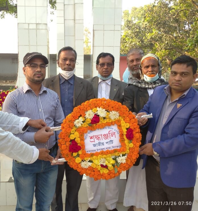 হ্যালো24 নিউজ।। মহান স্বাধীনতা ও জাতীয় দিবসে জাতীয় পার্টি কেন্দ্রীয় কমিটির সদস্য গত জাতীয় সংসদ নির্বাচনে দলীয় প্রার্থী মোঃ শাহিনুর ইসলামের নেতৃত্বে সূর্যোদয়ের সাথে সাথে শহীদ বেদীতে ফুুলেল শ্রদ্ধা নিবেদন করা হয়েছে। ফুুলেল শ্রদ্ধা নিবেদনে উপস্থিত ছিলেন কাহারোল উপজেলা জাতীয় পার্টির আহ্বায়ক হেলাল উদ্দিন, সদস্য সচিব মোঃ মনির হোসেন খাঁন, যুগ্ন সদস্য সচিব মোঃ শামীম ইসলামসহ কাহারোল উপজেলা জাতীয় পার্টির সকল ইউনিয়ন কমিটির সভাপতি ও সাধারণ সম্পাদকবৃন্দ।