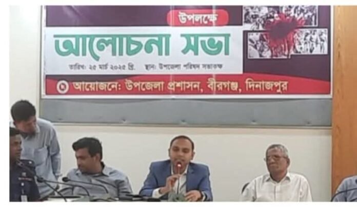 আজ ২৫ শে মার্চ গণহত্যা দিবস/২৫ উপলক্ষ্যে উপজেলা প্রশাসনের আয়োজনে আলোচনা সভা অনুষ্ঠিত হয়েছে। অনুষ্ঠানে উপজেলা নির্বাহী অফিসার তানভীর আহমেদ এর সভাপতিত্বে ২০২৫ গনহত্যা দিবসের আলোচনা সভায় বক্তব্য রাখেন বীরগঞ্জ থানার অফিসার ইনচার্জ মোঃ আব্দুল গফুর, উপজেলা প্রানী সম্পদ কর্মকর্তা মোঃ শাহরিয়ার মান্নান, উপজেলা প্রকৌশলী মোঃ জীবরীল আহমেদ, বীরগঞ্জ উপজেলা বিএনপির সাধারণ সম্পাদক আলহাজ্ব মোঃ জাকির হোসেন ধুলু, বীর মুক্তিযোদ্ধা মোঃ কবিরুল ইসলাম, উপজেলা যুব উন্নয়ন কর্মকর্তা মোঃ জামিল উদ্দিন মন্ডল, উপজেলা মহিলা বিষয়ক কর্মকর্তা নিবেদিতা দাস, উপজেলা সমাজ সেবা কর্মকতা মোঃ তরিকুল ইসলাম, উপজেলা প্রকল্প বাস্তবায়ন কর্মকর্তা মোঃ আহসান হাবীব সরকার,বাংলাদেশ জামায়াতে ইসলামী দিনাজপুর শাখার সহ সেক্রেটারী মোঃ মোঃ হাদীউজ্জামান, বৈষম্য আন্দোলনকারী ছাত্র নেতা জেমিযন রায, দি এশিয়ান এজ ও আলোকিত বাংলাদেশ পত্রিকার দিনাজপুর জেলা প্রতিনিধি মোঃ সিদ্দিক হোসেন সহ বিভিন্ন দপ্তরের কর্মকর্তা, বিভিন্ন শিক্ষা প্রতিষ্ঠানের প্রধান সহ রাজনৈতিক, বীর মুক্তিযোদ্ধা, সাংবাদিকগণ প্রমুখ।